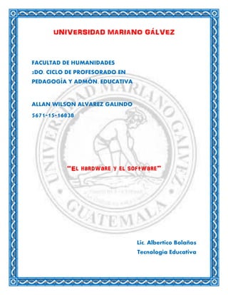 El documento describe la diferencia entre hardware y software. El hardware incluye los periféricos de entrada como el teclado y mouse que permiten introducir datos a la computadora, así como los periféricos de salida como el monitor e impresora que muestran la salida de información. El software se refiere a los programas, procedimientos, reglas, documentación y datos que permiten que el sistema funcione, e incluye más que solo los programas de computadora. Finalmente, se incluyen imágenes que ilustran ejemplos de hardware y software.