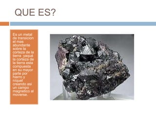 El documento proporciona información sobre el hierro. El hierro es el metal más abundante en la corteza terrestre y se ha utilizado desde el 2000 a.C. en Mesopotamia, Anatolia y Egipto. Existen diferentes tipos de hierro como el gris, blanco y maleable, y se ha usado ampliamente en la construcción de estructuras como columnas y vigas debido a su resistencia.