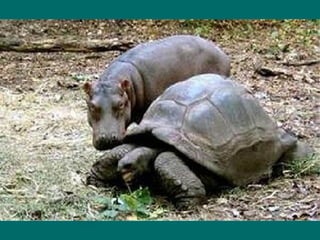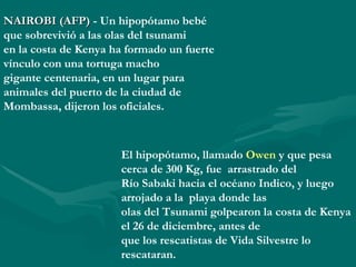 Un hipopotamo bebé que sobrevivió al tsunami en Kenia ha formado un fuerte vínculo de cuidado con una tortuga macho centenaria en un santuario de vida silvestre. El hipopotamo sigue a la tortuga como si fuera su madre y defiende agresivamente a la tortuga de cualquier amenaza. Los expertos dicen que esta relación muestra que las diferencias no importan cuando se necesita apoyo mutuo.