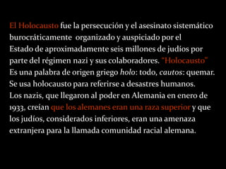 El Holocausto fue el genocidio sistemático de aproximadamente 6 millones de judíos a manos del régimen nazi y sus colaboradores. Los nazis crearon guetos, campos de concentración y campos de exterminio donde asesinaron judíos, gitanos, comunistas y otros grupos considerados "inferiores". Los niños judíos fueron especialmente vulnerables y más de 1 millón murieron bajo el gobierno nazi. Al final de la guerra, dos tercios de los judíos europeos habían sido asesinados en