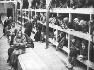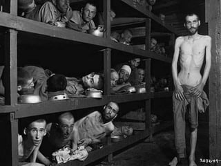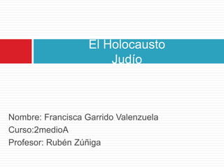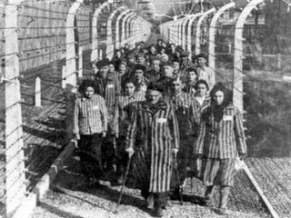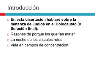 El documento habla sobre el Holocausto y la persecución de los judíos por parte de los nazis. Explica las razones por las que Hitler y los nazis querían matar a los judíos, incluyendo culparlos por la derrota de Alemania en la Primera Guerra Mundial y por los términos del Tratado de Versalles. También describe la Noche de los Cristales Rotos en 1938, cuando sinagogas y propiedades judías fueron atacadas y saqueadas, y la vida en los campos de concentración, donde los judíos er