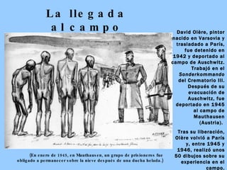 El documento presenta información sobre varios sobrevivientes y testigos de los campos de concentración nazis durante el Holocausto, incluyendo sus experiencias y relatos sobre las cámaras de gas, los crematorios, los experimentos médicos y las condiciones inhumanas. Se mencionan los campos de Auschwitz, Buchenwald, Dachau y Mauthausen, así como los testimonios de David Olère, Primo Levi y Eugen Kogon sobre sus tiempos en los campos y la destrucción sistemática de judíos y otros prisioneros.