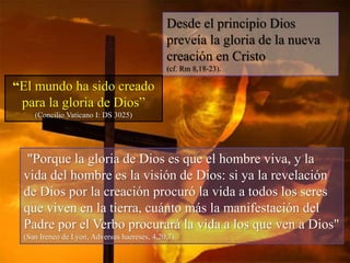 El documento examina la relación entre el hombre y Dios, la creación del hombre a imagen de Dios y las consecuencias del pecado original, destacando la pérdida de la gracia y los dones preternaturales. Se aborda cómo Cristo, a través de su muerte y resurrección, establece el plan de salvación y la regeneración de los creyentes. A lo largo del texto, se enfatiza la importancia de la fe y las virtudes en la búsqueda de la divinización y la salvación final.