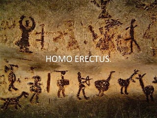 Homo erectus fue una especie extinta de homínido que vivió en Asia entre 1.8 millones y 300,000 años atrás. Se caracterizaba por su estatura promedio de 1.8 metros y su postura erguida. Habitó principalmente en yacimientos de Java, China y el Cáucaso, y fue el primer homínido en controlar el fuego y desarrollar herramientas más elaboradas.