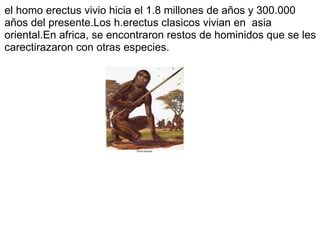 El Homo erectus vivió entre 1.8 millones y 300,000 años atrás. Era robusto, con un tamaño hasta de 1.8 metros, y un volumen craneal variable entre 800 y 1200 centímetros cúbicos. Cazaba grandes animales como elefantes y rinocerontes en grupos, lo que les permitió desarrollar mayor inteligencia y lenguaje. Utilizaron el fuego para cocinar sus alimentos, lo que redujo el tamaño de sus muelas e intestinos, indicando un cambio en su dieta de alimentos crudos a