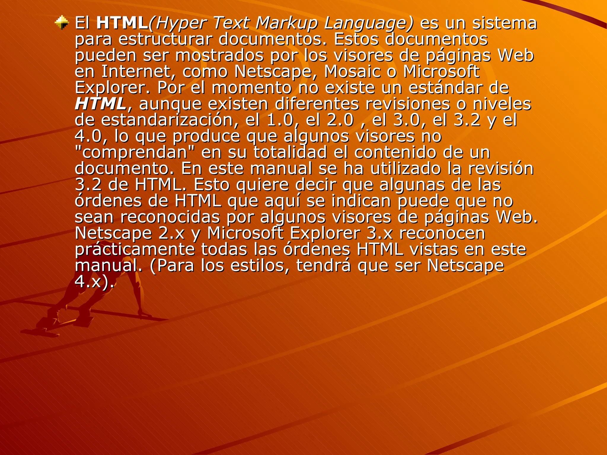 El documento explica que HTML es un lenguaje de marcado que se usa para estructurar documentos que se muestran en páginas web. Describe los elementos básicos de HTML como etiquetas, atributos y la estructura general de un documento HTML, incluyendo la cabecera, cuerpo y etiquetas como <title>, <head>, <body>. También explica cómo agregar formato al texto y fondo usando atributos como bgcolor, link y vlink.