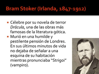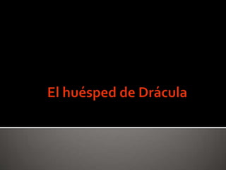 El documento resume la novela Drácula de Bram Stoker. Narra la historia de un joven abogado inglés llamado Jonathan Harker que viaja al castillo del conde Drácula en Transilvania y descubre su verdadera naturaleza de vampiro. Más adelante, Drácula viaja a Inglaterra para propagar su maldición. La novela aborda temas como el papel de la mujer y la inmigración en la época victoriana.
