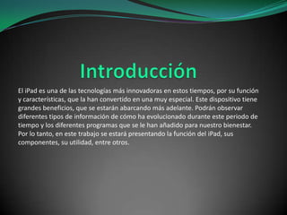El documento presenta información sobre el iPad, incluyendo su historia, características, generaciones, usos y aplicaciones. El iPad es una tableta desarrollada por Apple que permite navegar la web, ver videos, y más. Ha evolucionado a través de cinco generaciones, mejorando su rendimiento, tamaño y accesorios. El iPad es una herramienta útil para trabajo, educación y entretenimiento.