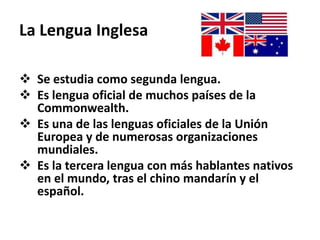 El idioma inglés surgió en los reinos anglosajones de Inglaterra y se extendió por Escocia bajo la influencia del reino de Northumbria. A través del Imperio Británico y los Estados Unidos, el inglés se difundió por todo el mundo desde el siglo XVIII, convirtiéndose en el idioma principal del discurso internacional y la lengua franca en muchas regiones. Actualmente, el inglés es la tercera lengua más hablada y se estudia ampliamente como segunda lengua.