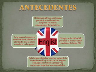 El documento describe la evolución del idioma inglés. Comenzó como una lengua germánica hablada por tribus que migraron a Inglaterra, conocida como inglés antiguo. Más tarde, recibió influencias del francés durante la invasión normanda, transformándose en el inglés medio. Finalmente, el inglés moderno temprano surgió durante el Renacimiento, consolidándose como la lengua literaria dominante.