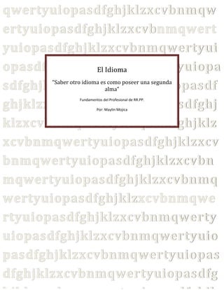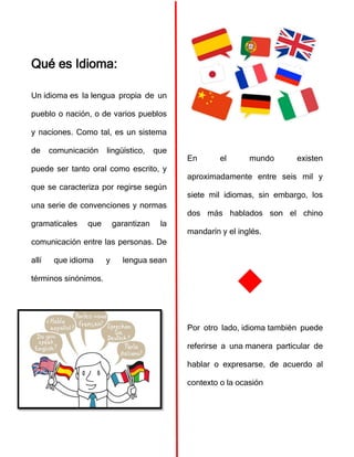 El documento presenta información sobre idiomas, incluyendo definiciones de términos como idioma, dialecto, idioma nativo e idioma oficial. También proporciona datos sobre el número de idiomas en el mundo y cuáles son los siete idiomas más hablados, liderados por el mandarín y el inglés. Finalmente, ofrece 10 consejos para aprender idiomas de manera efectiva, como tener un fuerte motivación, sumergirse en la cultura del idioma y practicar de forma divertida.