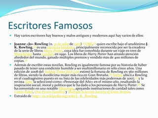El documento presenta información sobre dos escritores famosos: J.K. Rowling, autora de la serie de libros Harry Potter, y Gabriel García Márquez, escritor colombiano ganador del Premio Nobel de Literatura en 1982. Rowling es reconocida por crear la popular serie de Harry Potter, mientras que García Márquez es considerado uno de los autores más significativos del siglo XX.