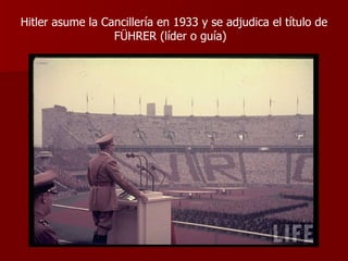 El documento resume los principales aspectos del ascenso y consolidación del poder de Hitler y el régimen nazi en Alemania entre 1933 y 1945, incluyendo el incendio del Reichstag en 1933 que permitió a Hitler asumir poderes dictatoriales, la organización de las SA, SS y Gestapo para controlar al pueblo, la Noche de los Cuchillos Largos en 1934 donde Hitler eliminó a sus rivales de las SA, y el antisemitismo del régimen que culminó en la Noche de los Cristales Rotos en 1938 y el Holocausto. Explica también el papel clave
