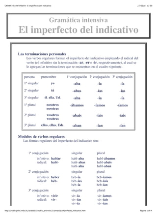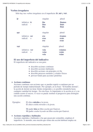 El documento explica el uso del imperfecto del indicativo en español. Describe las terminaciones del imperfecto para verbos regulares de las tres conjugaciones y los tres verbos irregulares. Explica que el imperfecto se usa para describir acciones continuas, habituales, sin principio o fin, procesos mentales y estados físicos, y para proveer contexto para acciones en el pasado.