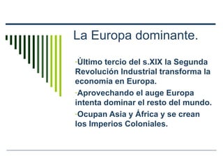 El documento describe el imperialismo europeo y sus causas en el siglo XIX. Europa dominó Asia y África creando imperios coloniales para fines económicos, demográficos y políticos. Las potencias europeas repartieron y explotaron estas regiones, introduciendo avances pero también transformaciones económicas, sociales y culturales que afectaron profundamente a las poblaciones locales.