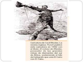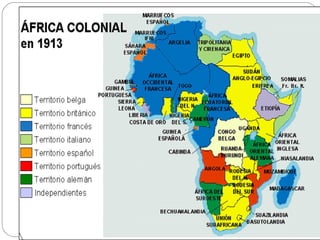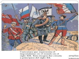 El documento describe el imperialismo entre 1870 y 1914, cuando los países europeos industrializados expandieron su dominio político y económico sobre África, Asia y otras partes del mundo. Las razones incluyeron la necesidad de materias primas y nuevos mercados para los productos manufacturados, así como creencias en la superioridad racial europea y la misión civilizadora. Los países europeos establecieron colonias, protectorados y zonas de influencia, y desestructuraron las formas de vida y culturas de los pueblos dominados.