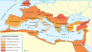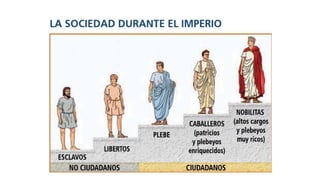 El documento describe la historia del Imperio Romano. Explica cómo las conquistas militares llevaron a desigualdades sociales y conflictos civiles. También describe la organización política bajo Augusto, con el Senado y los gobernadores provinciales. Finalmente, detalla aspectos de la economía romana como el comercio, las ciudades, la familia y la agricultura.