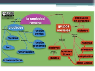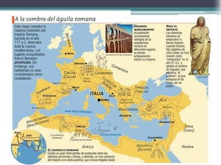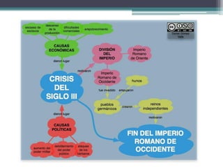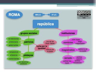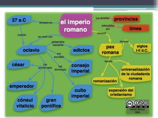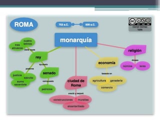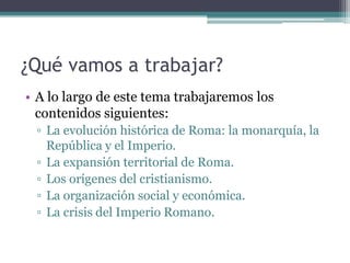 Este documento resume la evolución histórica del Imperio Romano desde sus orígenes como monarquía en el siglo VIII a.C. hasta su caída en el siglo V d.C. Explica cómo Roma pasó de ser gobernada por reyes a una república, y luego se transformó en un imperio bajo el liderazgo de Octavio Augusto en el siglo I a.C. También describe la expansión territorial de Roma a través de guerras como las Púnicas, y el apogeo del imperio durante los siglos I y II d