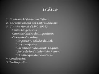 El documento analiza el impresionismo, enfocándose en Claude Monet y su relación con el contexto histórico-artístico, destacando la influencia de la ciencia y la fotografía en el arte del siglo XIX. Se describen las características del impresionismo, como la captura de la luz y el color, y se mencionan obras clave de Monet, incluyendo 'Impresión, salida del sol' y 'El estanque de los nenúfares'. Finalmente, se concluye que el impresionismo renovó la pintura y tuvo un impacto duradero en el arte posterior.