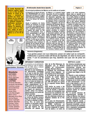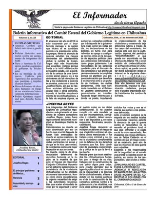 El documento es un boletín informativo del Gobierno Legítimo de Chihuahua que incluye noticias locales y artículos de opinión. Denuncia el asesinato de Josefina Reyes, defensora de derechos humanos en Chihuahua, y critica la militarización fallida y la violencia resultante del operativo conjunto del gobierno federal. También critica la corrupción e impunidad de las autoridades y la mafia que controla el poder en México.