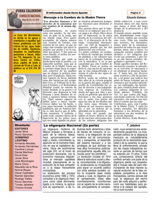 Este boletín informativo del Gobierno Legítimo de Chihuahua contiene noticias sobre violencia, derechos humanos y la situación económica en México. Incluye editoriales sobre la hipocresía del gobierno actual y los daños causados por la guerra contra el narcotráfico. También presenta un mensaje de Eduardo Galeano en apoyo a la Cumbre de la Madre Tierra en Bolivia y un artículo sobre la formación de la oligarquía mexicana a partir de la reforma liberal del siglo XIX.