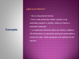 Este documento describe los conceptos, tipos y estructura básica de un informe. Explica que un informe es un documento formal donde una persona rinde cuentas sobre un hecho o actividad a una autoridad. Incluye diferentes tipos de informes como científicos, técnicos y de divulgación. Además, detalla la presentación típica de un informe de investigación escolar, incluyendo portada, índice, resumen, introducción, desarrollo, resultados, conclusiones y referencias. Por último, proporciona indicaciones sobre