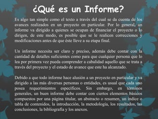Este documento define qué es un informe y sus características principales. Explica que un informe proporciona detalles sobre el progreso de un proyecto para quienes lo financian o dirigen. Un buen informe debe ser claro, preciso y contener suficientes detalles para que cualquier lector lo comprenda. También debe incluir elementos como un resumen, índice, introducción, metodología, resultados, conclusiones y anexos. Los informes pueden ser técnicos, científicos, de divulgación o mixtos, y