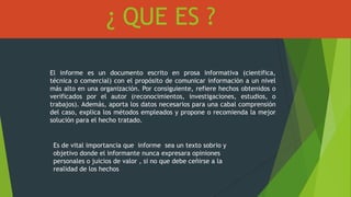 Este documento describe las características y estructura de un informe. Explica que un informe es un documento escrito que tiene como propósito informar sobre los resultados de una investigación de manera objetiva. Los informes pueden clasificarse en científicos, técnicos, de divulgación o mixtos dependiendo del tema y audiencia. La estructura varía pero generalmente incluye una introducción, desarrollo, y conclusión. El objetivo final de un informe es comunicar información de manera clara y precisa.