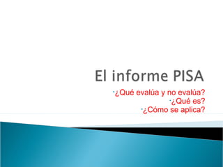 El documento describe la evaluación PISA realizada cada 3 años por la OCDE a estudiantes de 15 años para medir sus habilidades en lectura, matemáticas y ciencias. Mide la capacidad de aplicar conocimientos a situaciones prácticas, no solo lo aprendido en la escuela. Los factores socioeconómicos como el nivel educativo y la ocupación de los padres influyen significativamente en los resultados, al igual que el origen de los estudiantes.