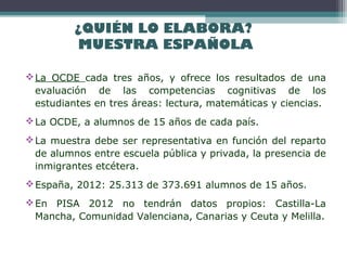 Este documento resume los aspectos clave de la evaluación PISA realizada por la OCDE. PISA evalúa las competencias en lectura, matemáticas y ciencias de estudiantes de 15 años cada 3 años en los países de la OCDE. La evaluación mide la capacidad de los estudiantes para aplicar sus conocimientos en situaciones prácticas y no pretende evaluar currículos o sistemas educativos. Los resultados ofrecen perfiles de conocimiento de los estudiantes y cómo se relacionan con factores socioeconómicos. Los factores socioeconómicos