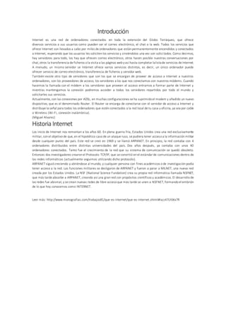 Internet es una red global de ordenadores que ofrece servicios como correo electrónico, chat y páginas web. Los servicios son proporcionados por servidores, que son ordenadores permanentemente conectados a Internet. Los usuarios se conectan a proveedores de acceso que les permiten acceder a los servicios de los servidores de todo el mundo. Los inicios de Internet se remontan a la década de 1960 con la creación de ARPANET por el ejército de Estados Unidos, que luego evolucionó para incluir más universidades y organizaciones y finalmente se convirtió