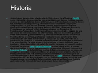 Internet es una red mundial descentralizada de redes interconectadas que utiliza protocolos TCP/IP. Se originó en 1969 como ARPANET para conectar universidades en California y Utah. Un servicio popular es la World Wide Web, desarrollada en 1990, que permite la consulta remota de archivos de hipertexto a través de Internet. Existen muchos otros servicios como correo electrónico, transferencia de archivos y conversaciones en línea.