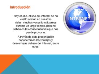 El documento presenta las ventajas y desventajas del uso del internet. Entre las ventajas se encuentra que hace la comunicación más sencilla y permite acceder a información de todo el mundo. Sin embargo, también tiene desventajas como exponer a menores a contenidos inadecuados y generar dependencia que afecta el estudio y trabajo. Se recomienda un uso moderado del internet y buscar ayuda ante señales de adicción.