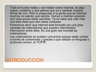Internet está formado por una red mundial de ordenadores interconectados que pueden intercambiar información. Se originó en la década de 1960 para permitir que investigadores compartieran recursos entre computadoras. Hoy en día, miles de millones de personas acceden a Internet a través de conexiones fijas, inalámbricas y móviles para buscar información, usar redes sociales y correo electrónico, y navegar por sitios web usando navegadores como Google, Yahoo y Microsoft Bing.