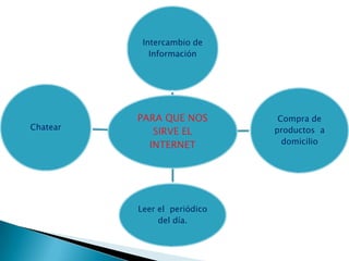 El documento describe las diferentes herramientas y métodos para conectarse a Internet, incluyendo conexiones por cable, ADSL, satélite, redes inalámbricas y LMDS. Explica que Internet es una red global de ordenadores que ofrece servicios como correo electrónico, chat y web.