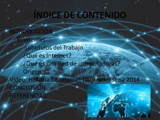 El documento trata sobre el Internet. Explica que el Internet es una red global de computadoras que permite compartir información de forma rápida y económica. Se origina en 1969 como un proyecto militar estadounidense llamado ARPANET y ha revolucionado la comunicación al conectar a personas de todo el mundo. El documento también describe algunas herramientas comunes del Internet como el correo electrónico, los motores de búsqueda y los lectores RSS.