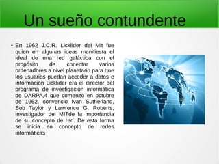 El documento describe la historia del desarrollo de Internet. En 1962, J.C.R. Licklider del MIT propuso la idea de una red galáctica que conectara ordenadores a nivel mundial para compartir datos e información. Esto llevó al desarrollo de ARPANET en 1969, la primera red de computadoras. En 1990, Tim Berners-Lee desarrolló el World Wide Web en el CERN, creando HTTP y HTML y permitiendo a los usuarios compartir y publicar información de forma más fácil. Hoy en día, Internet es una red global que perm