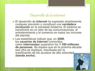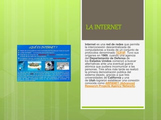 El documento describe los orígenes e historia de Internet, desde su creación por el gobierno de EE.UU. en 1969 para propósitos militares hasta su desarrollo como red mundial descentralizada. Explica algunos de los servicios más importantes como la World Wide Web, el correo electrónico, los foros y la transferencia de archivos, e indica que Internet se ha convertido en un pilar fundamental de la comunicación, el entretenimiento y el comercio a nivel global.