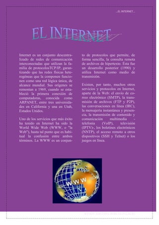 Internet es una red mundial de redes interconectadas que utiliza el protocolo TCP/IP. Sus orígenes se remontan a 1969 con la creación de ARPANET. La World Wide Web es un sistema de distribución de información basado en hipertexto que utiliza Internet como medio de transmisión. Existen muchos servicios en Internet además de la Web, como el correo electrónico y la transmisión de archivos.