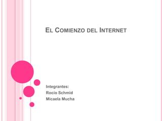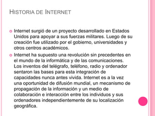 Internet surgió de un proyecto militar estadounidense en la década de 1960. Se desarrolló la primera red de paquetes llamada ARPANET que conectó cuatro universidades. A finales de la década se popularizó el correo electrónico y otras aplicaciones permitieron el crecimiento de Internet.