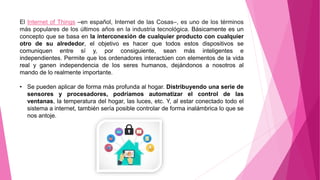 El documento habla sobre el Internet de las Cosas. Es un concepto que se basa en la interconexión de cualquier producto con cualquier otro, con el objetivo de hacer que los dispositivos se comuniquen entre sí y sean más inteligentes e independientes. Algunos ejemplos de cómo ya se usa incluyen la automatización del hogar, el control de infraestructura urbana y ambiental, y el sector de la salud.
