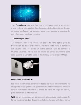 Internet es una red global que permite el acceso a una gran biblioteca virtual de conocimiento desde cualquier lugar del mundo. Es el máximo exponente de la globalización ya que facilita la compra, venta e intercambio de productos, servicios e información entre personas de diferentes lugares. Las redes se componen de dispositivos conectados que comparten recursos e información. Existen diferentes tipos de conexiones como por cable, wifi o satélite para acceder a internet. Los protocolos como TCP/IP, FTP y HTTP establecen las reglas para la comunicación entre dispositivos.