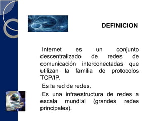 1) El documento habla sobre Internet y las redes, que son infraestructuras fundamentales para el comercio electrónico. 2) Explica conceptos como protocolos TCP/IP, direcciones IP, dominios y diferentes tipos de conexión a Internet. 3) Detalla varios servicios en línea como correo electrónico, chat y FTP, así como tipos de redes como LAN, WAN y MAN.