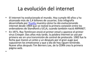 El documento describe la evolución de Internet desde su creación en 1969 como ARPANET hasta convertirse en una red global en la actualidad. Algunos hitos clave incluyen el primer correo electrónico en 1971, la creación de la World Wide Web por Tim Berners-Lee en 1989, el lanzamiento de Google en 1998 y la aparición de redes sociales como Facebook en 2004 y YouTube en 2005 que ayudaron a Internet alcanzar 2,4 mil millones de usuarios en 2012.