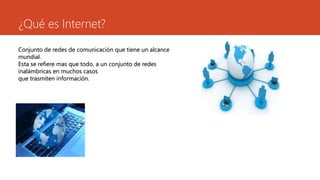 El documento resume lo que es Internet, cómo funciona y sus ventajas. Internet es un conjunto de redes de comunicación a nivel mundial que transmiten información a través de hardware como satélites, cables y ordenadores, y software como navegadores web y sistemas de codificación. Los navegadores web nos permiten acceder al contenido de Internet y facilitan la búsqueda de información de forma entretenida y para desarrollarnos tecnológicamente.