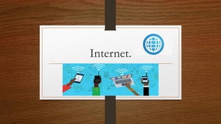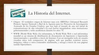 El documento describe la historia y evolución de Internet desde su origen con ARPANet hasta la actualidad. Comenzó como una red académica y gubernamental estadounidense en los años 70, y su uso se expandió a inicios de los 90 con la introducción del World Wide Web. La Web 1.0 consistía en páginas estáticas, mientras que la Web 2.0 permitió la participación de usuarios y contenido generado por ellos a través de blogs y redes sociales. La Web 3.0 busca hacer la red semántica mediante etiquetado de contenido,