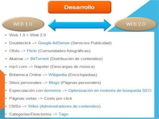 El documento describe los orígenes y el desarrollo de Internet, así como sus principales ventajas y desventajas. Entre las ventajas se encuentran la comunicación a bajo costo con personas de todo el mundo, el acceso a una gran cantidad de información y entretenimiento. Entre las desventajas están la exposición a contenido inadecuado, la adicción excesiva y la distracción en el trabajo y estudios. El documento también incluye enlaces a fuentes bibliográficas sobre el tema.