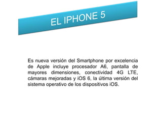 El documento describe las nuevas características del iPhone 5, incluyendo una pantalla más grande de 4 pulgadas, conectividad 4G LTE, cámara mejorada, procesador A6 y sistema operativo iOS 6. Estará a la venta el 21 de septiembre en varios países a precios entre $199 y $399 dependiendo del almacenamiento.