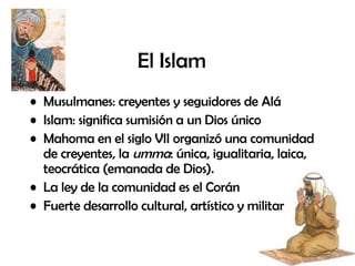 El documento describe la invasión árabe de la península ibérica en el siglo VIII y el posterior dominio musulmán en Al-Andalus hasta su caída en el siglo XV. Los árabes encontraron una infraestructura romana bien establecida y estructuras socio-políticas visigodas. El Califato de Córdoba llevó a un esplendor cultural, pero luego Al-Andalus se dividió en reinos independientes. Finalmente, los reinos cristianos reconquistaron gradualmente la península a lo largo de ocho