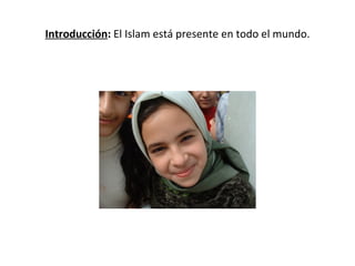 Este documento resume los principales aspectos del Islam como religión y cultura. Explica que Mahoma fundó el Islam en el siglo VII en la península arábiga y que se expandió rápidamente por el norte de África, Oriente Medio y la península ibérica. También describe elementos clave como La Meca, la Kaaba, la organización política bajo los califas, la arquitectura de las mezquitas y la influencia del periodo de Al-Andalus en España.